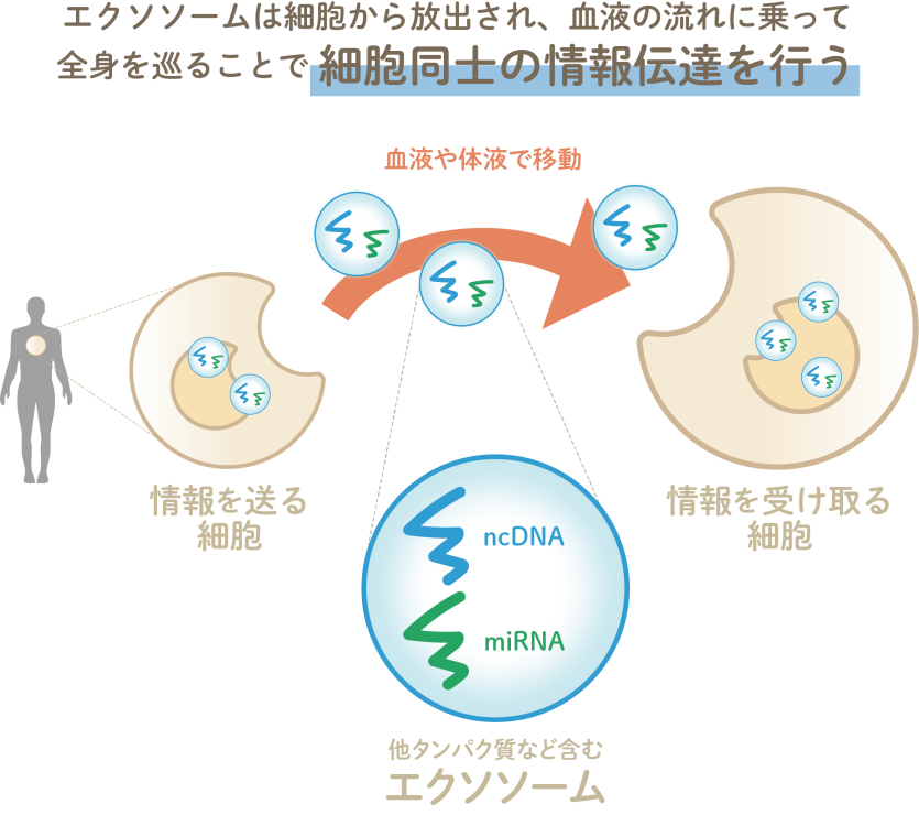 ヒトでは血液や尿のほか、母乳、唾液、涙などのあらゆる体液中に含まれています。マイクロRNAがエクソソームを受け取った細胞の中に取り込まれて機能します。